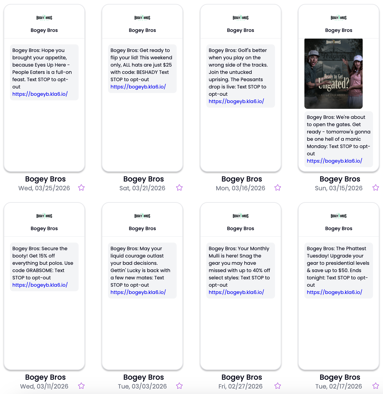 Bogey Bros. writes some of the best SMS copy. Every message has a voice — "True love is enabling each other's terrible shot selection", "Whatever you're hiding, we don't ask questions. We just provide coverage". See all of Bogey Bros. Q1 messages.