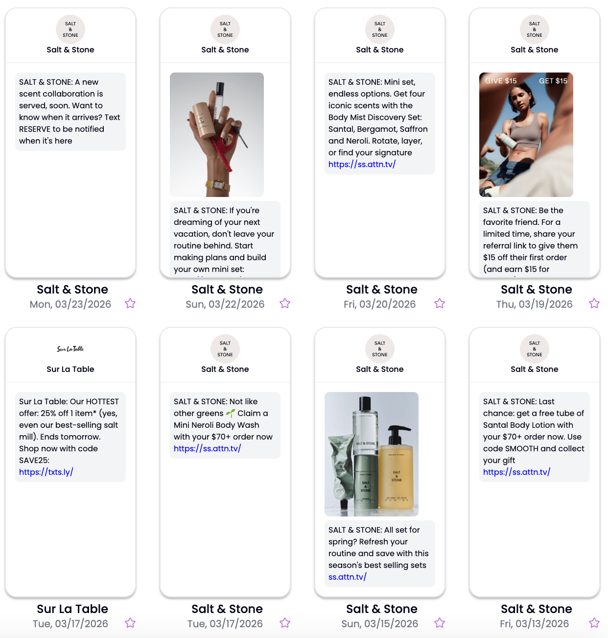 Salt & Stone is the most active new brand we’re tracking. They sent more than 40 messages this quarter, and their program reads like a Masterclass in scarcity sequencing. The Saffron Body Mist restocked, sold out, and restocked again across multiple messages, each cycle creating a small event out of inventory. See all of Salt & Stone’s Q1 messages.
