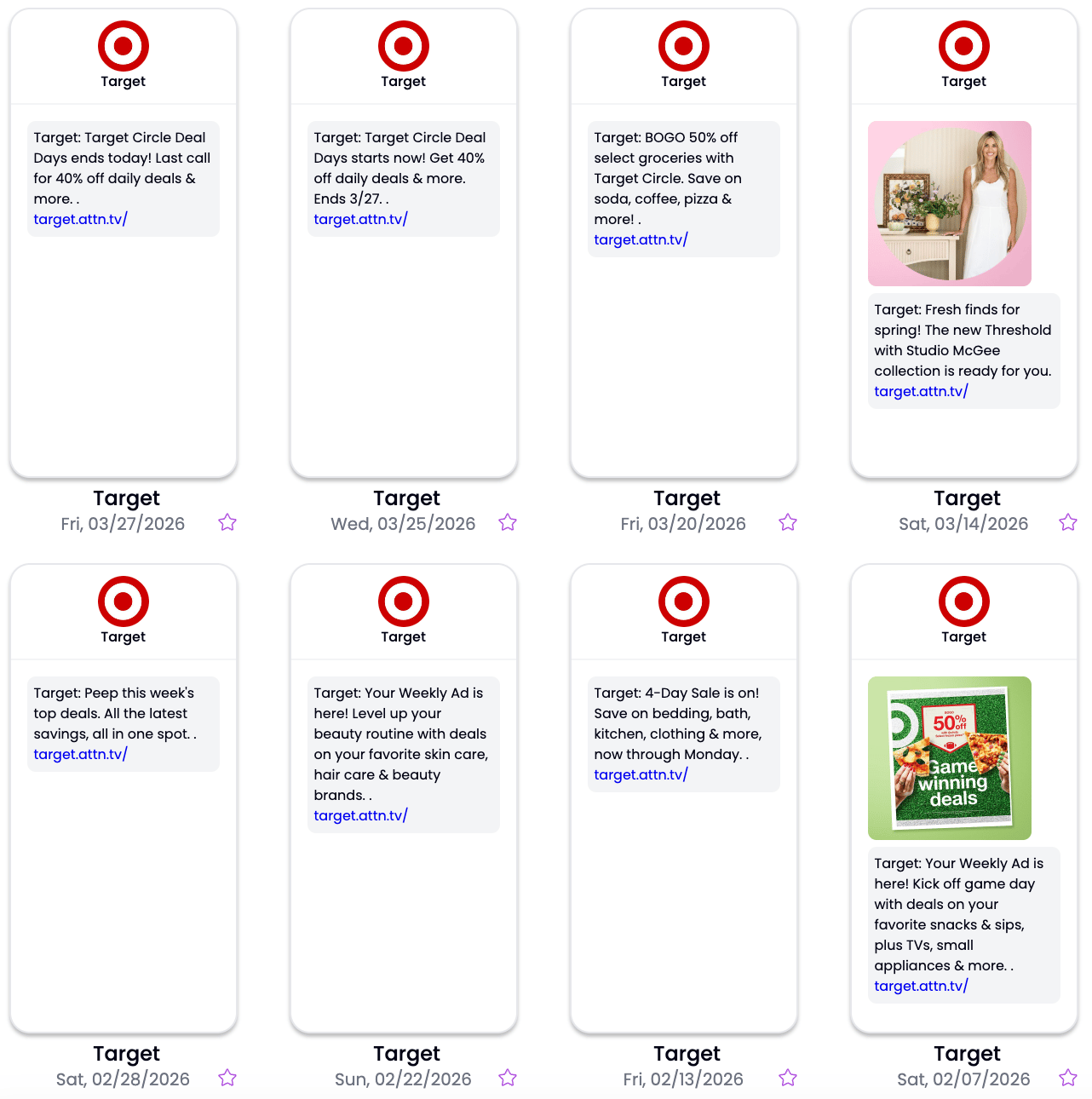 Target’s SMS messages read like a circular, with weekly ad alerts, category promotions, and Circle deal pushes on a near-mechanical cadence. At 13 messages across the quarter it's restrained for a brand their size. See all of Target’s Q1 messages.