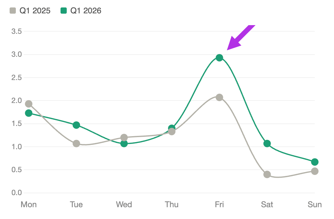 Discretionary spending may be slowing down, but Friday and Saturday remain consumers’ highest-spend days. Brands like Domino’s, Chili’s, Jeni’s, Graza, and Maker Wine are increasing their campaigns at the end of the week to grab more of those dollars. Could this work for your brand as well?